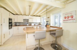 KITCHEN/BREAKFAST ROOM: (4.69m x 3.55m) Fitted with an extensive range of shaker style base and wall units, wood effect preparation surfaces over and upstands above. Ceramic single sink unit with vegetable drainer to side, column mixer tap over and casement windows to front. Fitted appliances include a Lamona oven with grill above, four ring ceramic hob with extraction above and a dishwasher. Staircase rising to first floor, range of exposed ceiling timbers and a peninsula unit with breakfast bar overhang. The kitchen units comprise a range of soft close cutlery drawers, fold out carousel larder style units, corner carousel units and deep fill pan drawers. Door to useful understair storage recess and further door with Suffolk latch to: