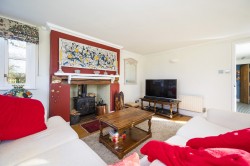SITTING ROOM: (4.96m x 3.95m) Afforded a dual aspect with timber framed, double glazed casement window range to side and rear and affording views across the gardens and Colne Valley beyond. The focal point of the room is a central fireplace with wood burning stove, oak mantel over and engineered oak flooring. Timber framed double doors opening to: