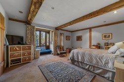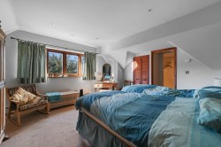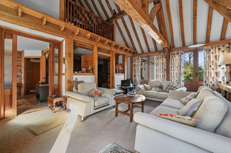 SITTING ROOM An impressive room that is beautifully presented and complemented by large windows that bathe the room in natural light with double doors opening to the grounds. This versatile and comfortable setting is perfect for relaxation. The sitting room boasts a stunning vaulted ceiling, showcasing an impressive display of exposed timbers and studwork, adding to its character and charm.