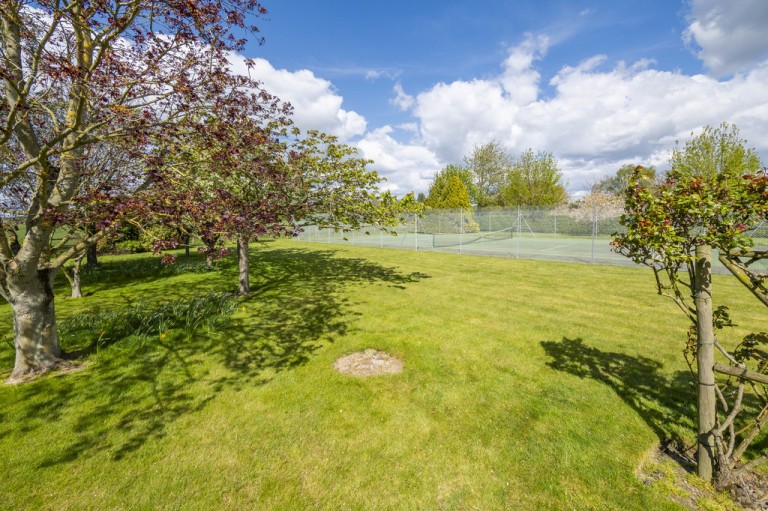 A substantial expanse of lawn set to rear is interspersed by leylandii, established beds, mature planting and a tennis court with fence line border. With a range of fledgling and mature trees, fence line borders to side and views to rear across open farmland.