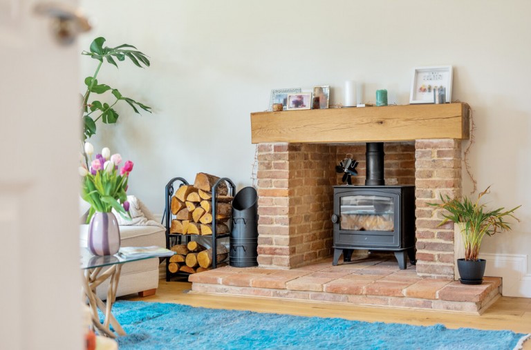 DRAWING ROOM: A pretty double aspect reception room with fitted units and shelving creating the effect of a media wall. The focal point of the room is provided by an inset red brick fireplace with red brick hearth and bressummer over which is home to a log burning stove. There is a set of French style double doors opening on to the terrace abutting the rear of the property and double doors leading to:-