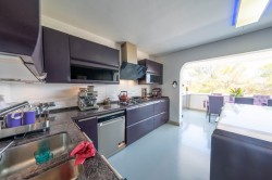 On entering, you will be welcomed by the spacious ‘open-plan’ living room, kitchen and dining area with double height ceiling and feature fireplace with log burner, complemented by contemporary furnishings and stylish decor. The large fully fitted luxury kitchen is equipped with high-end appliances and features a breakfast ‘island’, ample counter space and ‘concertina’ windows with views across the bay of Palma. The dining area has direct access to the main terrace and pool area. Guest cloakroom/w.c.