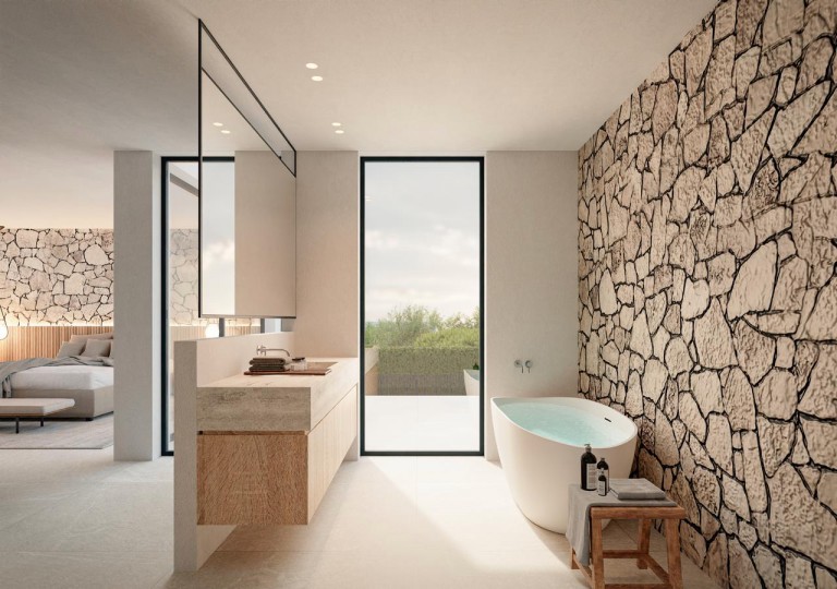 The ground floor provides 207m2 of living space, plus 35m2 of covered terrace, leading to the 48m2 pool and open pool terrace. The accommodation on this floor includes an ‘open plan’ lounge/dining/kitchen, a double bedroom with en-suite bathroom, a second bedroom or study.