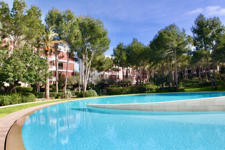 The bright modern interior provides a substantial living/dining room that opens onto a private terrace with lovely views across the landscaped gardens and pool area with sliding louvered screens that provide extra security and privacy when required. Spacious reception hall. Top quality fitted and equipped kitchen/breakfast room with separate utility/laundry room. There are two large bedrooms, well-appointed and fitted providing lots of wardrobe space, each has a luxury en-suite bathroom and there is a guest cloakroom/w.c.
