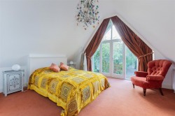 The master bedroom has a high vaulted ceiling and French doors out to a large covered balcony from which there are fine extended views over the garden and farmland beyond. This master suite incorporates a bathroom and a large dressing area with fitted wardrobes.