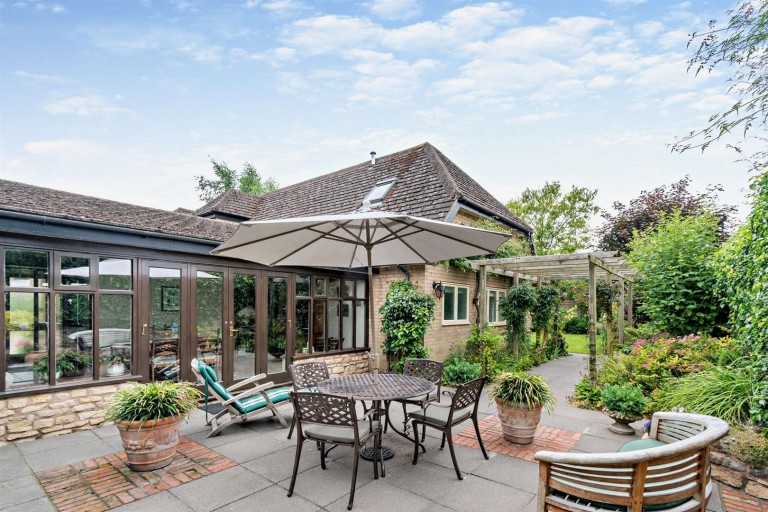 The south-west facing rear garden is made up of a mixture of patios, lawn space and mature planting offering a fantastic outdoor space to enjoy throughout the seasons. A large patio sits directly off the living and dining rooms providing a wonderfully private seating area, ideal for outdoor entertaining. From the patio, a timber pergola walkway leads through well-established soft planting to the main garden.