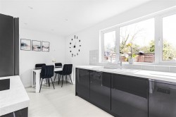 Kitchen - Re-fitted base and eye level units, integral dishwasher, induction hob with extractor over, double oven, space for fridge/freezer, window, radiator, under stairs cupboard.