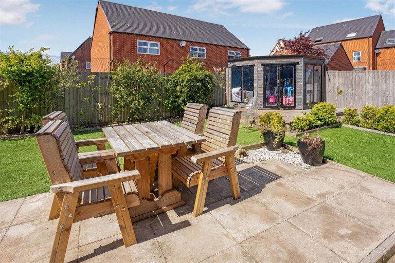 * The landscaped rear garden and has a large paved seating area, artificial lawn with a border of beds with plants, a raised wooden deck with a timber garden room. Personal door to the rear of the garage and gated side access.