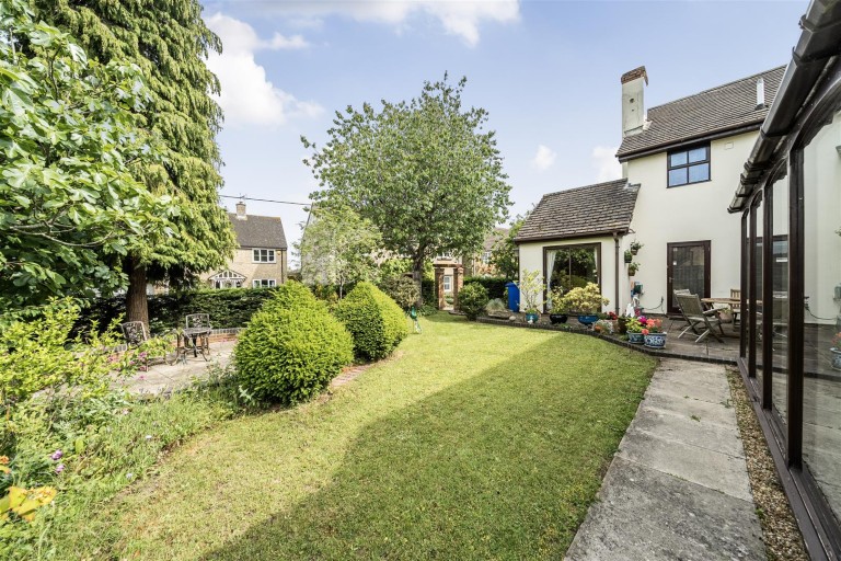 Outside - Privately situated within Pury End, the property is approached by a block paved driveway, providing off-road parking for numerous vehicles and access to the double garage through an electric door. The beautiful mature gardens extend around the property, mostly laid to lawn with two patio seating areas and well-stocked borders. The garden further benefits from a timber shed, a greenhouse, and useful lean-to store.
