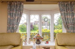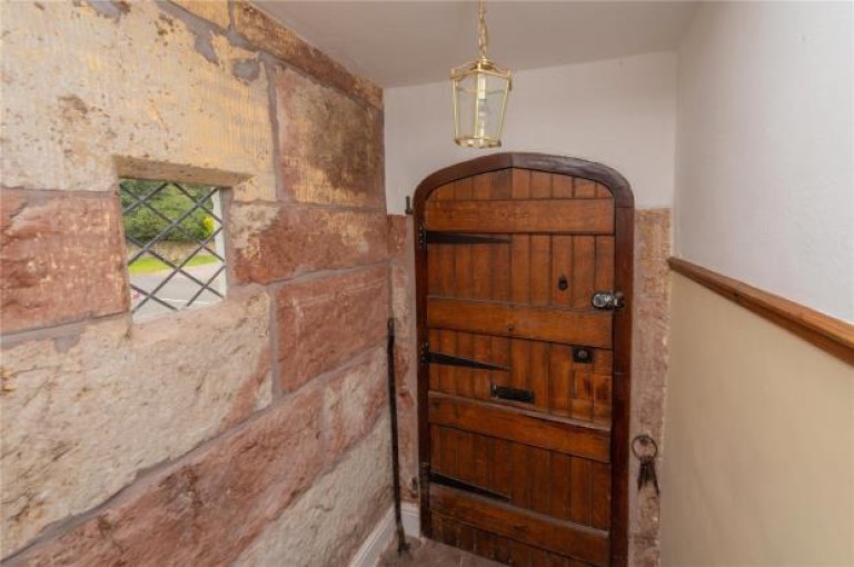 Entered via a Tudor arched solid oak door into a porch with sandstone walls, quarried tiled floor and glazed panelled door into a reception hallway off which is the striking dual aspect living room with a particularly attractive stone mullioned oriel bow window with beautiful stained-glass panels, side window overlooking the garden, natural stone open fireplace and herringbone flooring.