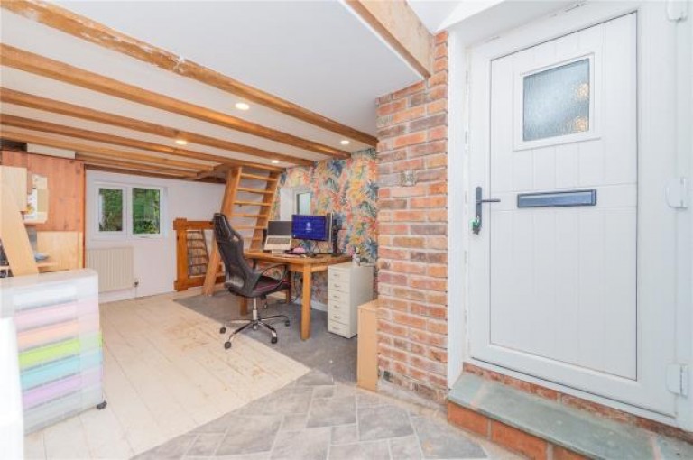 The kitchen has been attractively designed with blue and grey shaker-style units, complemented by solid wood countertops, inset sink, Smeg electric oven with five-ring gas hob and overhead extractor. Beneath the staircase, a convenient utility area offers additional countertop space, with plumbing for a washing machine and dishwasher. The room is finished with tiled flooring, exposed beams, and provides space for a dining table. A door leads to the rear of the property. Off the living room is a rear porch leading to a garden room, which is used as a boot room. There is also a useful outside utility/workshop adjoining the cottage.