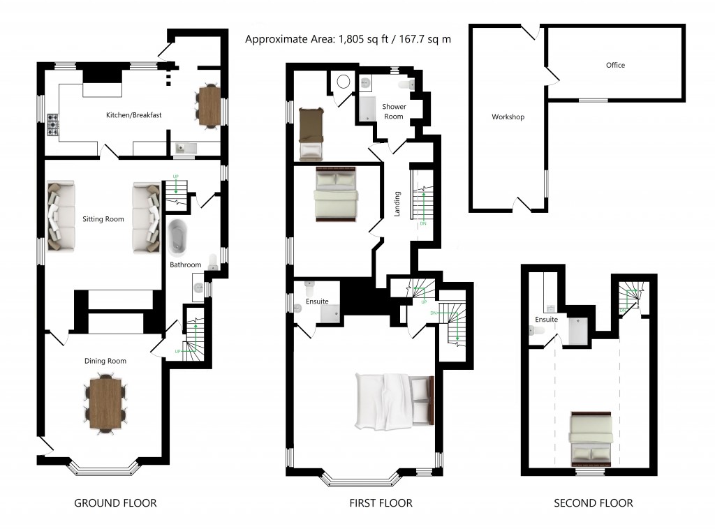 The accommodation comprises rear entrance lobby, kitchen/breakfast room, sitting room, dining room, inner lobby and jack and jill bathroom. The first floor is split in to two separate parts with one staircase leading to the principle bedroom, ensuite shower room and second floor bedroom and shower room. The second staircase case provides access to two further bedrooms and a shower room.