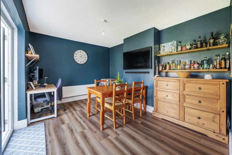 The hallway has Luxury Vinyl Tiles and a ground floor WC. The sitting room has feature bay window. The open plan kitchen / dining room is fitted with white gloss units with space for white goods stainless steel gas hob, extractor fan and double oven. There are patio doors from the dining / study area overlooking the rear garden.