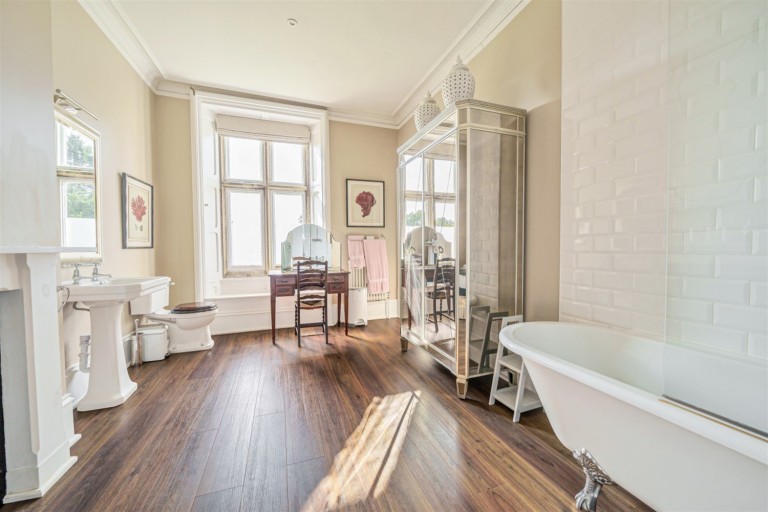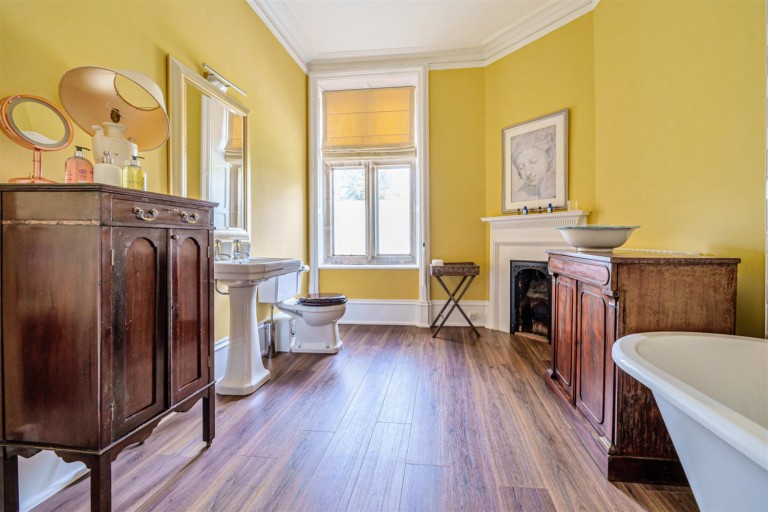 On the ground floor, the stone-tiled vestibule, which is of especial note with its stone fireplace and wood-pannelling, leads through the entrance hall and the games room. From here there is a large, dual-aspect drawing room, complete with a marble fireplace. Double doors take you into the kitchen; a modern, functional space with a generous breakfast bar and a number of integrated appliances. Another set of double doors lead you on into the former library, now a family/dining room. This is a generously-sized room, ideal for multi-purpose use.