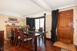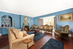 Entrance Hall/Dining Room and Family Room Beneath a porch created by a roof over the bay windows in the façade, the panelled front door opens into the entrance hall/dining room which, like the other two formal reception rooms, has wooden parquet flooring. There is a canted bay window overlooking the front drive with a painted wooden window seat and the original brick open fireplace with a highly decorative carved wooden mantelpiece with a marble inner and hearth. Most of the room has painted wooden panelling to picture rail height.